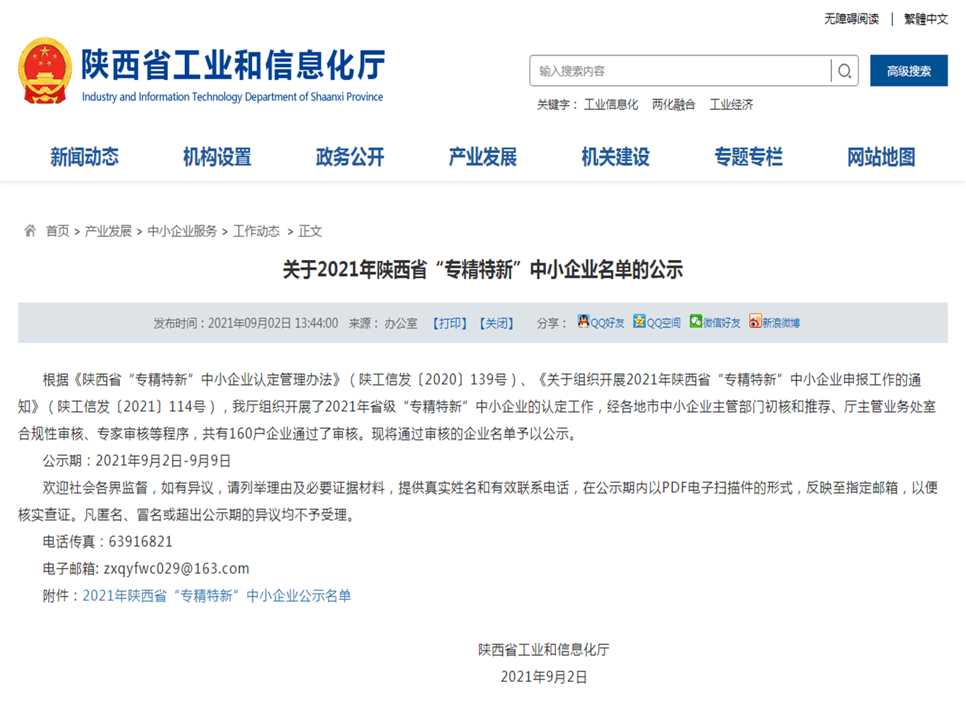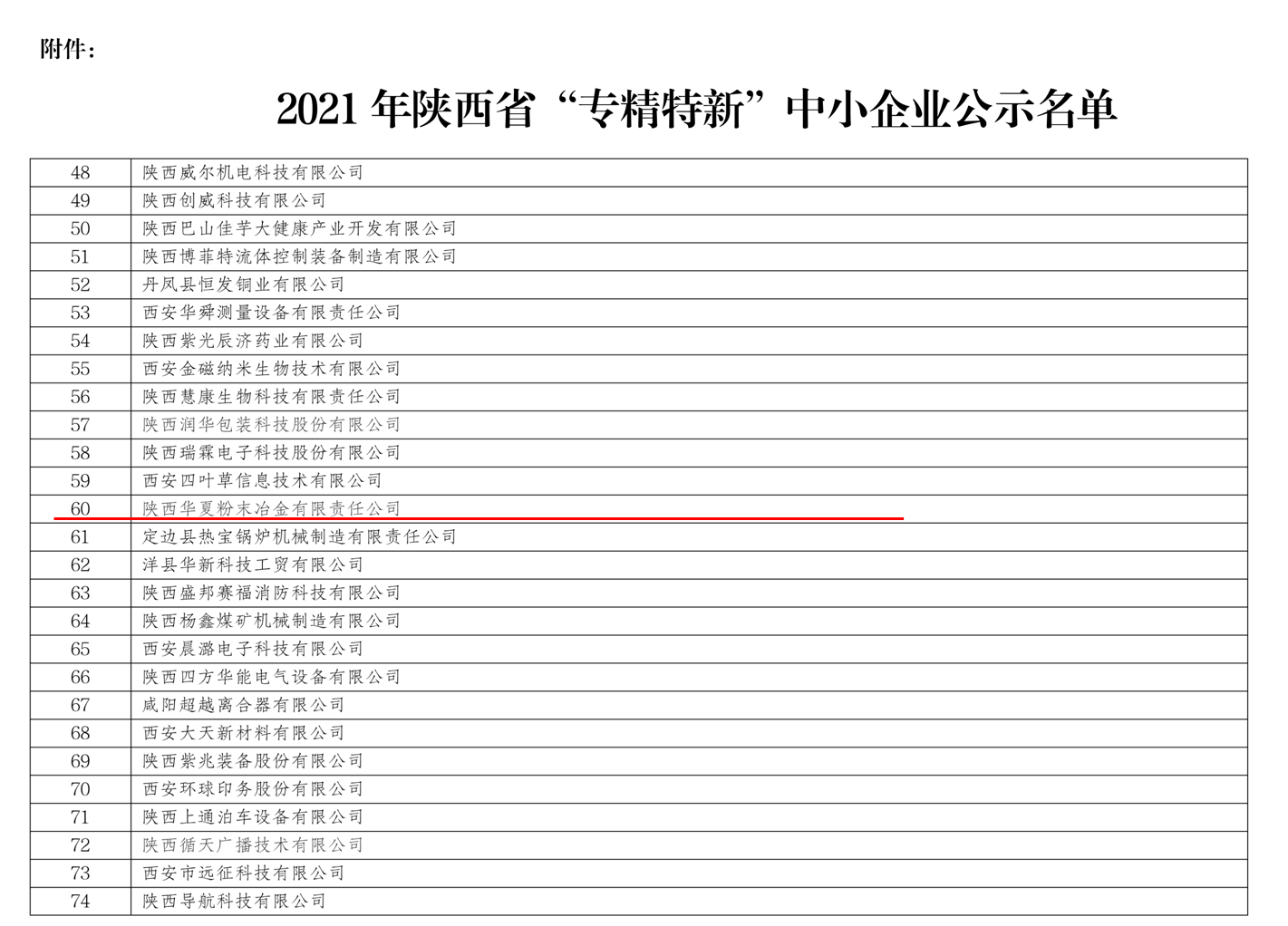 2021年9月2日,陜西省工業(yè)和信息化廳發(fā)布《關(guān)于2021年陜西省“專精特新”中小企業(yè)名單的公示》,“陜西華夏粉末冶金有限責(zé)任公司”及省內(nèi)160家企業(yè)榮登榜單。