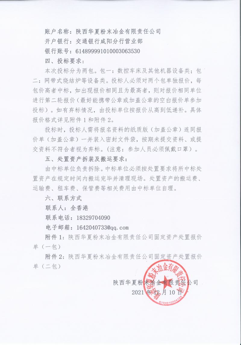 陜西華夏粉末冶金有限責(zé)任公司現(xiàn)有一批機(jī)器設(shè)備進(jìn)行公開處置,有關(guān)事項(xiàng)公告如下: