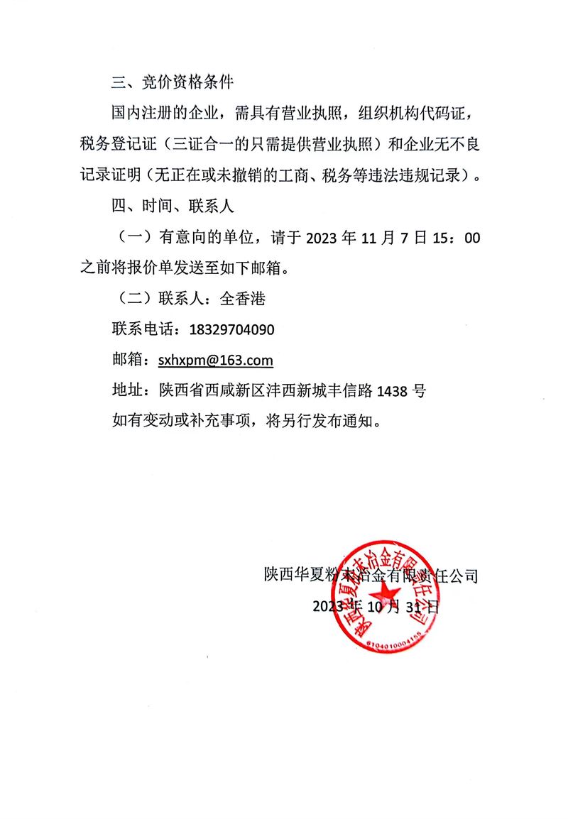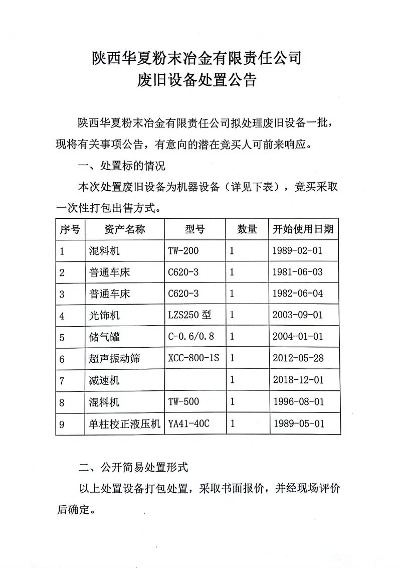 陜西華夏粉末冶金有限責(zé)任公司廢舊設(shè)備處置公告