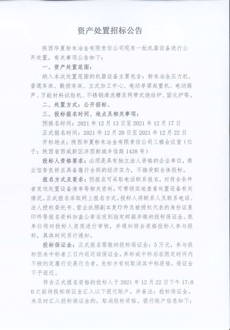 陜西華夏粉末冶金有限責(zé)任公司現(xiàn)有一批機(jī)器設(shè)備進(jìn)行公開處置,有關(guān)事項(xiàng)公告如下: